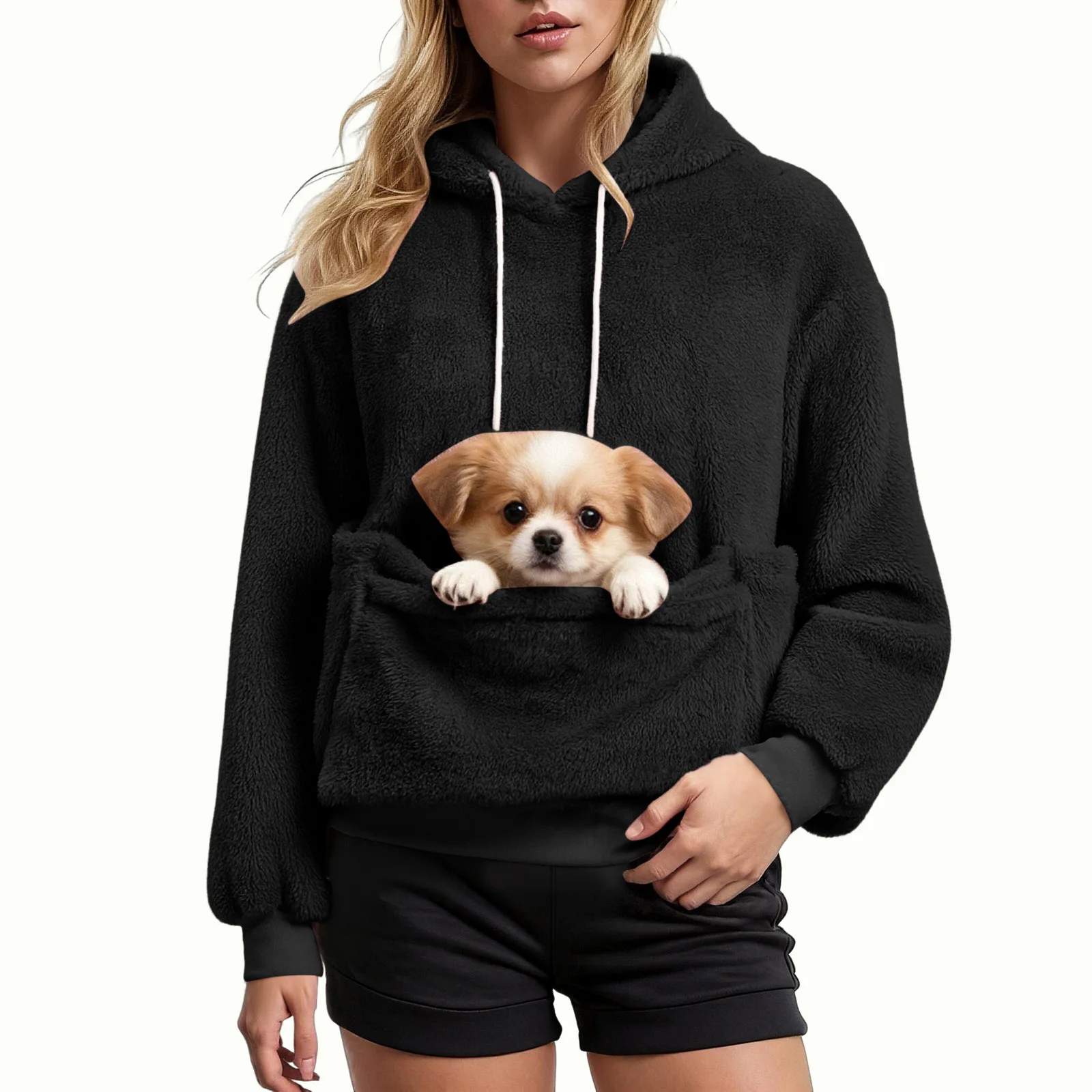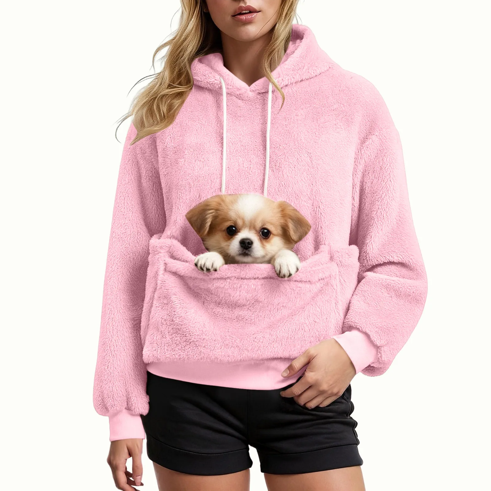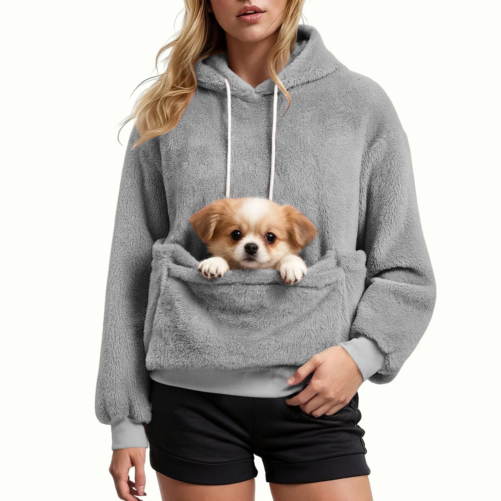 Women’s Plush Hoodie with Chihuahua Pocket – Cozy Autumn/Winter Pullover