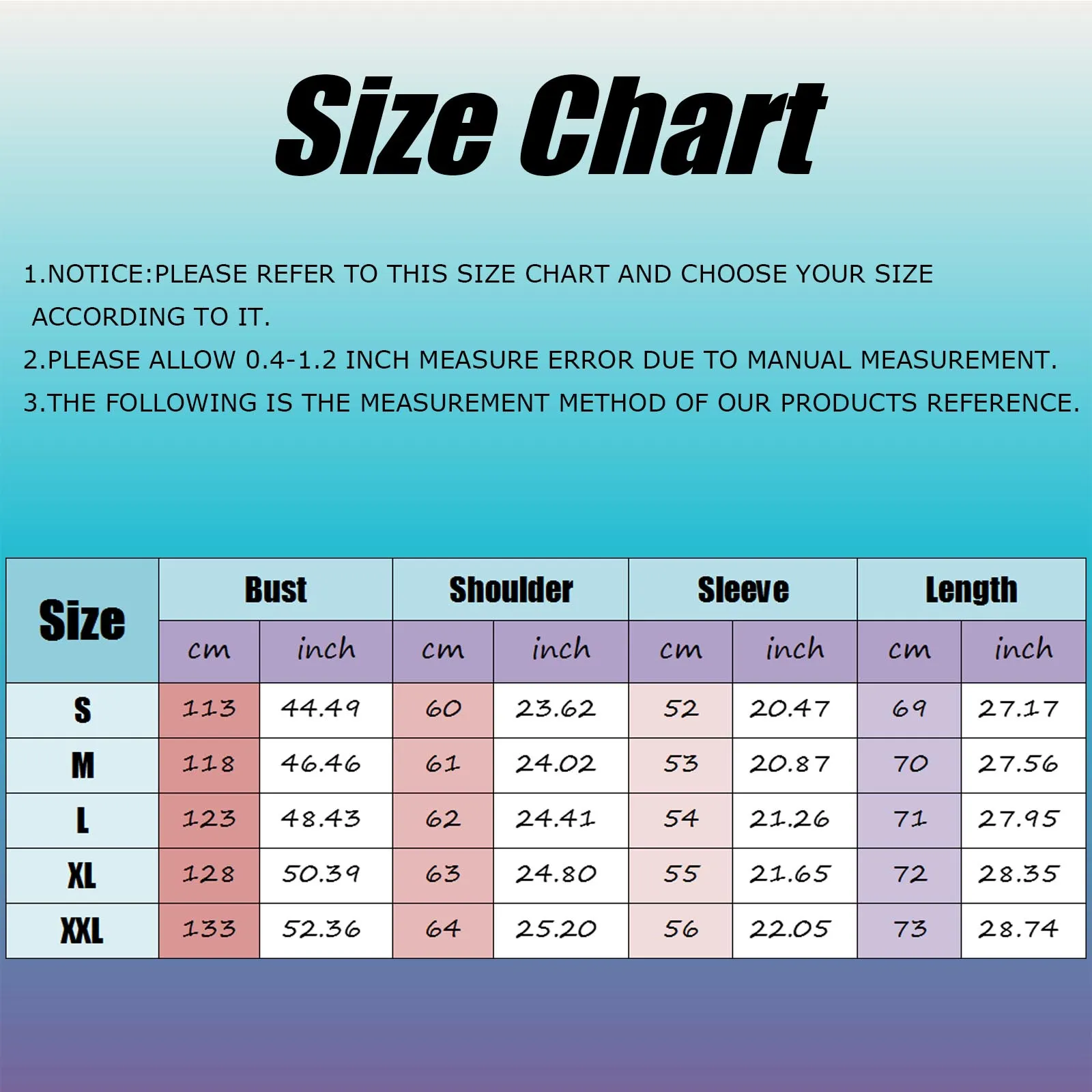 | Size:XL | Bust:128cm/50.39'' | Shoulder:63cm/24.80'' | Sleeve:55cm/21.65'' | Length:72cm/28.35'' |